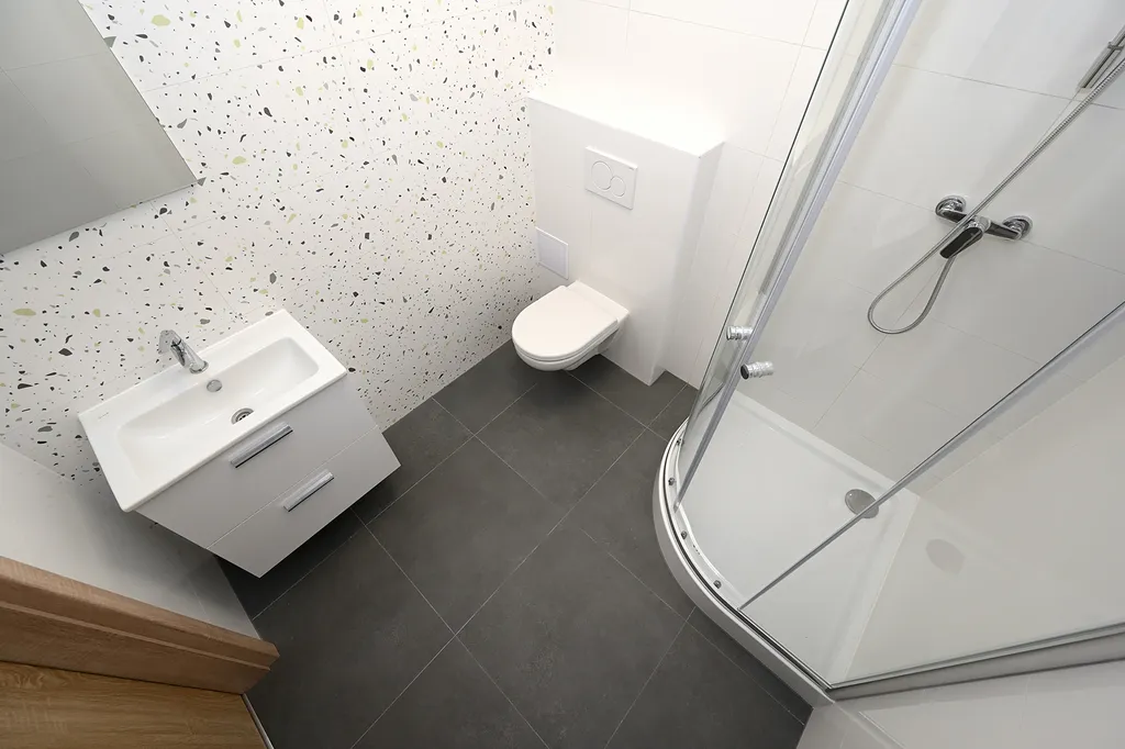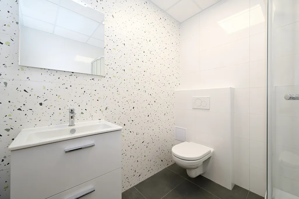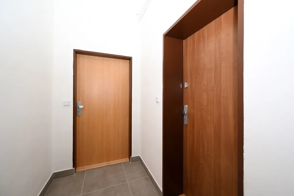Dispozice bytu zahrnuje předsíň (6 m²), hlavní obytnou místnost s kuchyňským koutem (22 m²) a koupelnu se sprchovým koutem a toaletou (4 m², bez pračky). Kuchyňská linka je vybavena vestavěnou lednicí s mrazákem, el. troubou, varnou deskou, myčkou a digestoří. Ohřev vody zajišťuje el. bojler, vytápění pak moderními stropními infrapanely, které poskytují příjemné a rovnoměrné teplo.