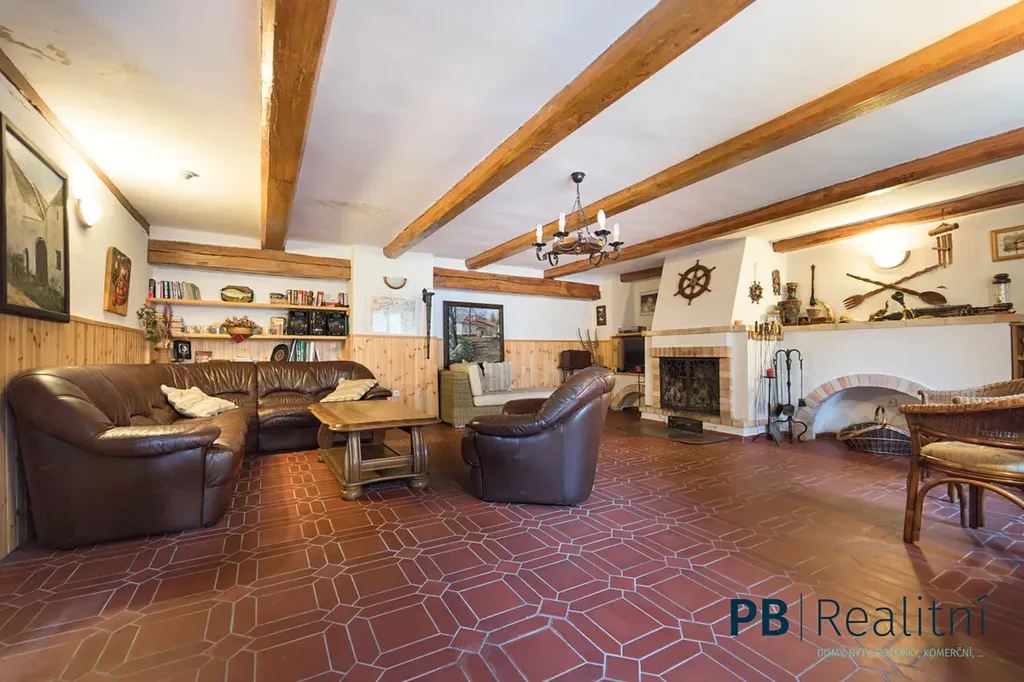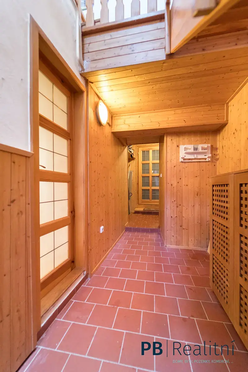 • Přízemí: obytné prostory v původním stylu, krb, kachlová kamna, kuchyně, sociální zázemí