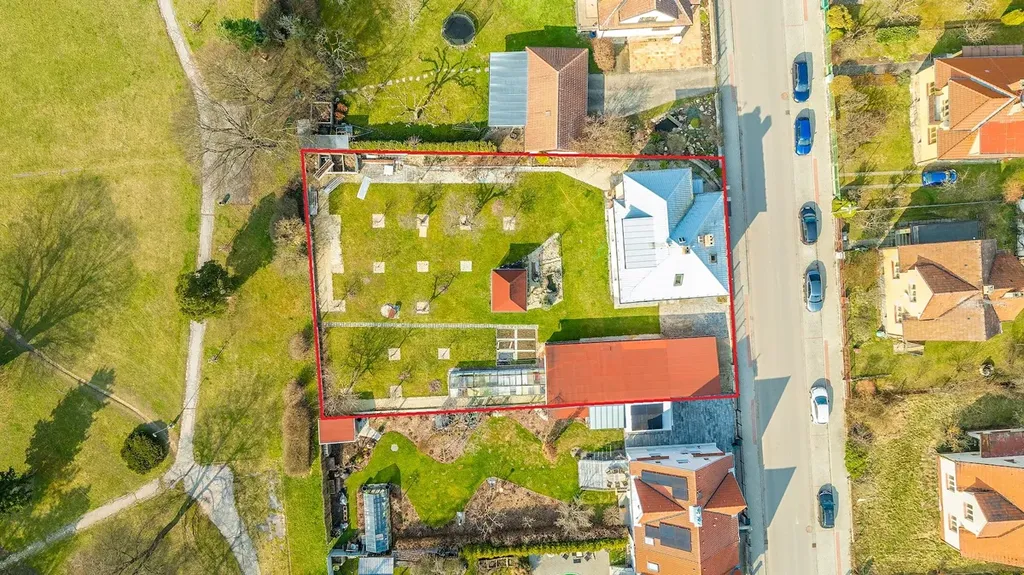 Na udržované, jihozápadně orientované zahradě se nachází hloubkový vrt s pitnou vodou, která je zavedena přímo do domu, díky čemuž nemovitost disponuje dvěma zdroji vody (obecní vodovod a vlastní studna). Součástí zahrady je také altánek, skleník a dostatek prostoru pro relaxaci i zahradničení. Zahrada zároveň nabízí příjemné soukromí a krásný výhled na park a rybník Trubný, přičemž poskytuje i další možnosti využití - například pro vybudování bazénu, sportovního zázemí nebo případnou další výstavbu (nutno ověřit dle územního plánu).