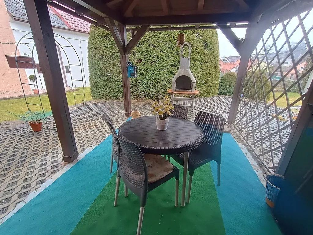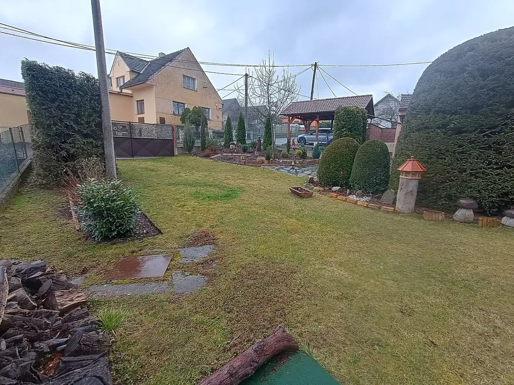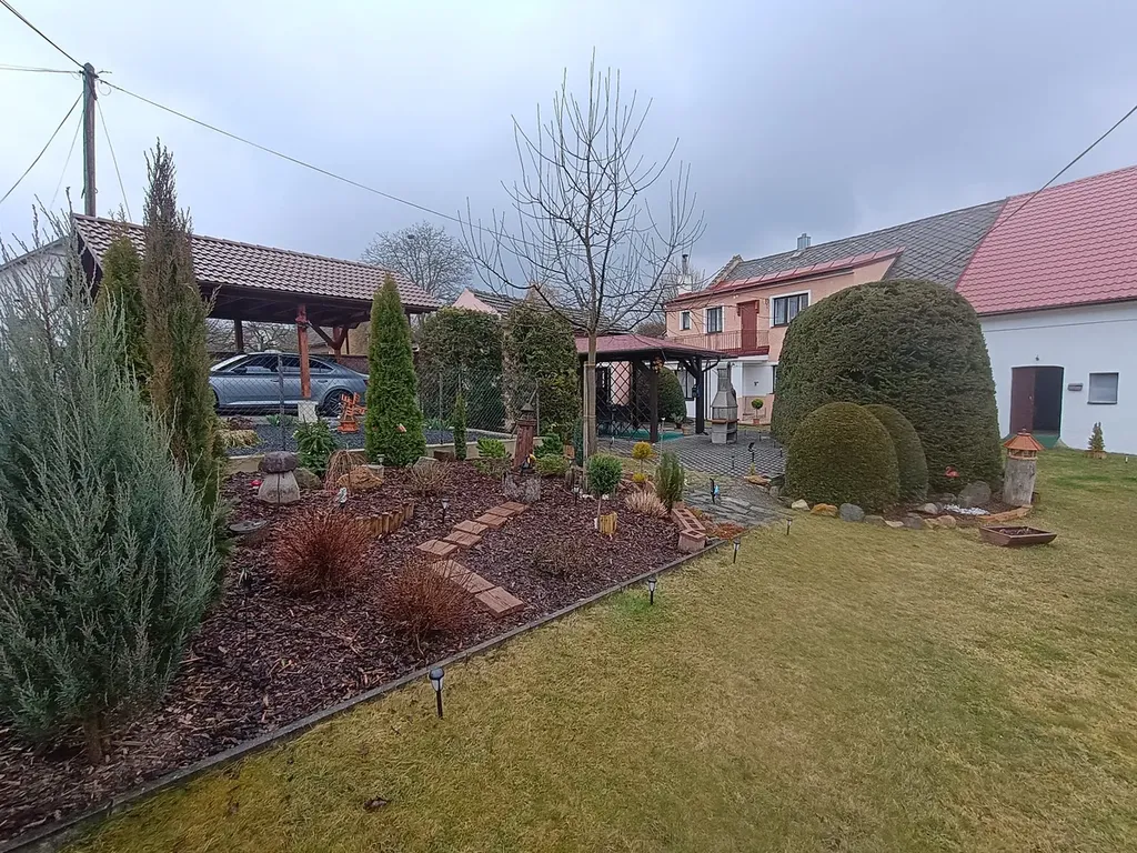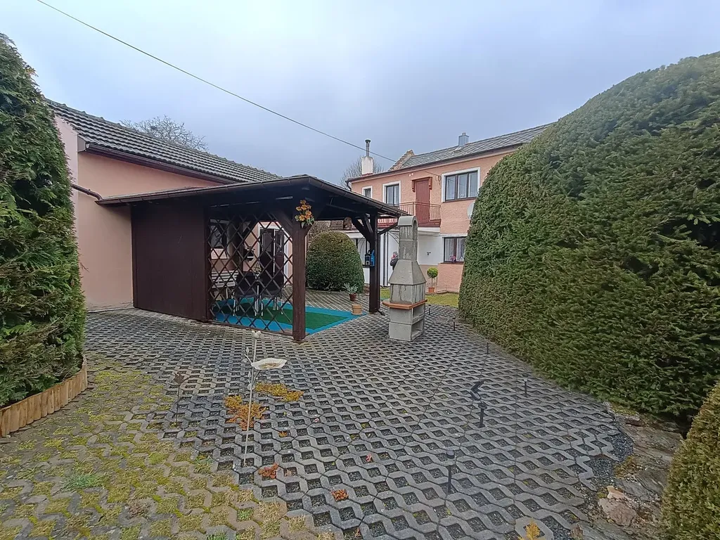 Na zahradě je umístěn domek kde je sklad dřeva, dílna a na to napojena pergola před kterou je venkovní Krb. Zahrada dle foto prošla kompletní rekonstrukcí a je připravena pro nového majitele k užívání a i příjemnému posezení . Z ulice možný vjezd na pozemek vraty či možnost vjezd rovnou pod zastřešené stání kde lze parkovat.