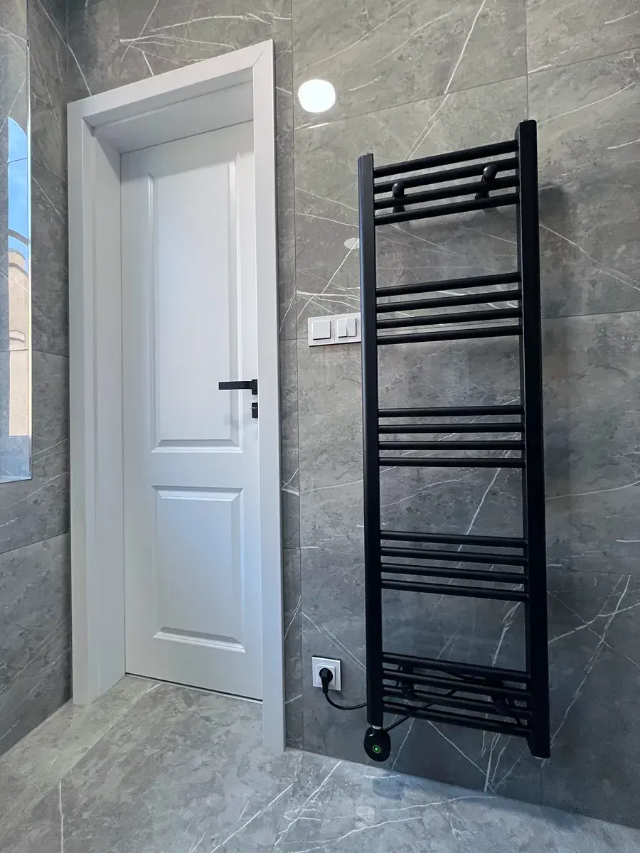 Koupelna nabízí moderní sprchový kout, minimalistické prvky a dostatek prostoru pro každodenní komfort. Je zde příprava na pračku a sušičku.