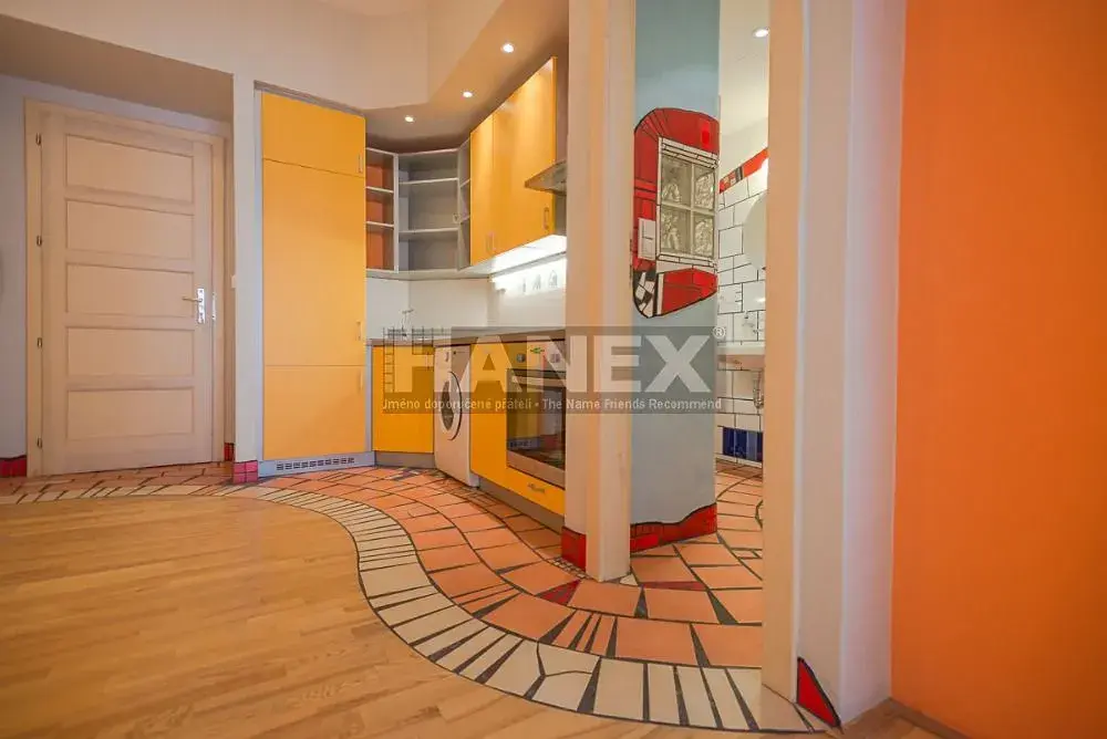 Nabízíme na pronájem útulný byt 1+kk o velikosti 38 m2 ve 3. patře domu s výtahem. Vynikající lokalita v blízkosti metra B Anděl, nákupního a obchodního centra Anděl (400 metrů), francouzská škola jen 100 m, stanice několika tramvajových linek 100 m. Zajímavě designově řešený byt má zařízenou kuchyň s pračkou, lednicí. Prostorný obývací pokoj. Koupelna s WC podle architekta F. Hundertwassera. Elektrické topení.