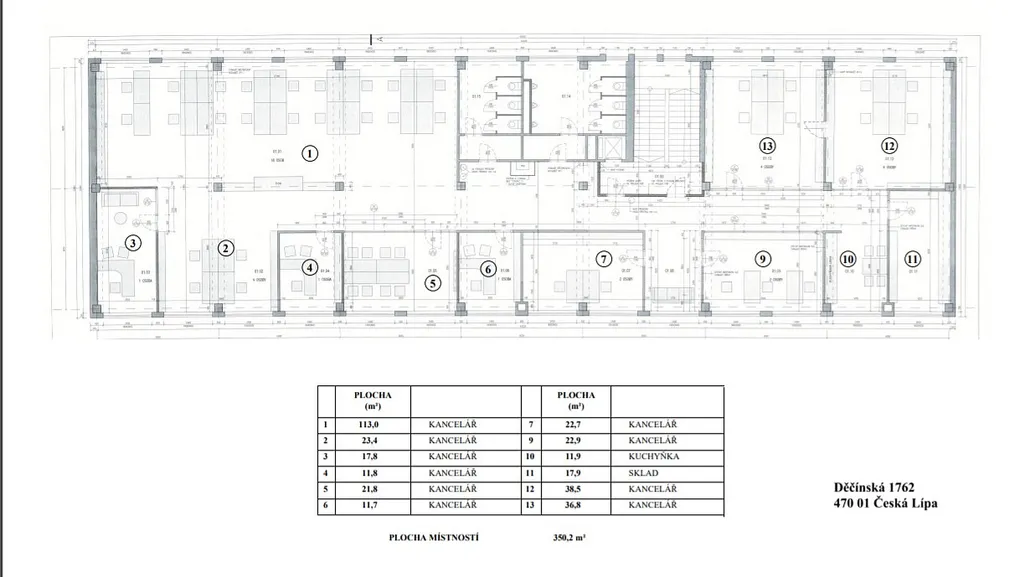 K pronájmu nabízíme celé rekonstruované první nadzemní podlaží v administrativní budově areálu Česká Lípa, Děčínská 1762. Jedná se o čtyřpodlažní budovu s plochou střechou, která prošla rekonstrukcí se zateplením v roce 2017. Nabízené podlaží bylo celkově zrekonstruováno v roce 2020. Prostory jsou vhodné jako kancelářské či pro lehkou výrobní činnost. Objekt je vybaven výtahem, centrální vrátnicí, v budově je k dispozici kapacitní internet. Vytápění je dálkové. Před administrativní budovou se nachází zastávka MHD. V blízkosti je nákupní centrum a pekárna. K dispozici jsou k pronájmu parkovací místa pro osobní vozy a také pro nákladní vozidla (kamiony). V areálu se nachází pneuservis, mycí linka a čerpací stanice. Ve dvoře je LIDL. Dostupné od 1.7.2026