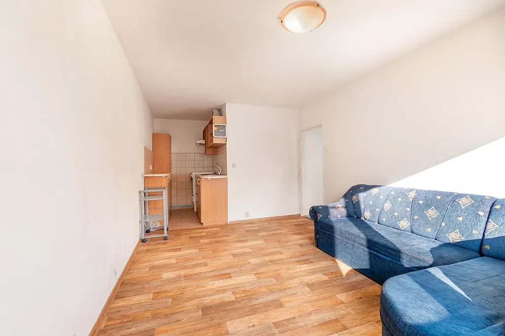 Obývací pokoj je propojený s kuchyňským koutem, zde je nová prostorná linka se sporákem, potravinová skříň.