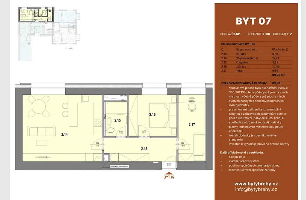 Bytová jednotka o dispozici 3kk s podlahovou plochou 63,84 m² a parkovacím stání před domem (v ceně bytu), se nachází ve 2. NP cihlového bytového domu. Byt disponuje vstupní chodbou, obývacím pokojem s kuchyňským koutem, ložnicí, dětským pokojem, koupelnou se sprchovým koutem a toaletou. Součástí je venkovní parkovací stání před domem a sklepní kóje. Byt je vybaven podlahovým vytápěním, vinylovou podlahou (dekor dub), plastovými okny s trojsklem a přípravou na venkovní el. žaluzie. Vytápění bytu i ohřev vody zajišťují tepelná čerpadla umístěná v technické místnosti v 1. NP.
