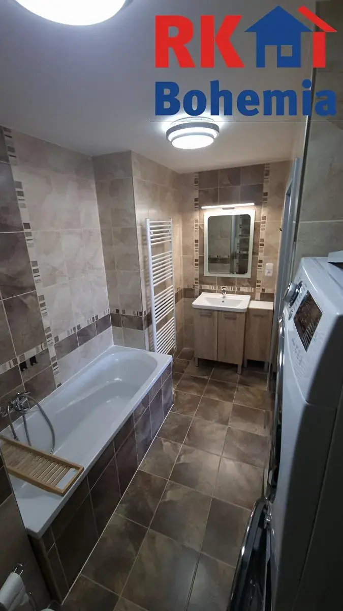 Velice povedenou pak hodnotím koupelnu, která byla rekonstrukcí zvětšena tak, že celková plocha je bezmála 6m2. Vybavení koupelny je bez nadsázky výborné. Naleznete zde prostornou vanu, WC, pračku, sušičku, osvětlené zrcadlo se skříňkou, el.žebřík, nové podhledy s výborným osvětlením, kvalitní obklady a celkový dojem nestísněného prostoru.