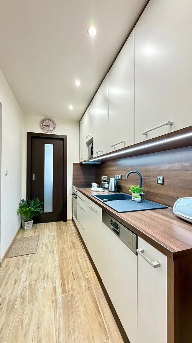 - kuchyň se spotřebiči (myčka, lednice, mrazák, varná deska, mikrovlnná trouba) a jídelním stolem se dvěma židlemi
