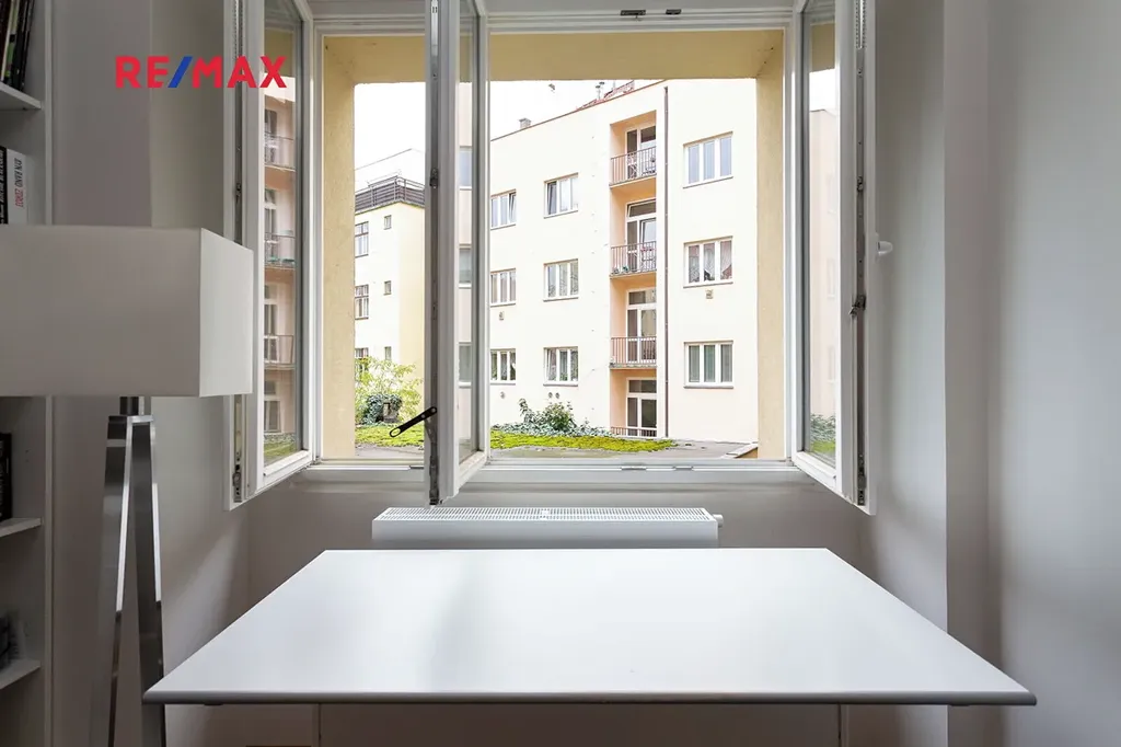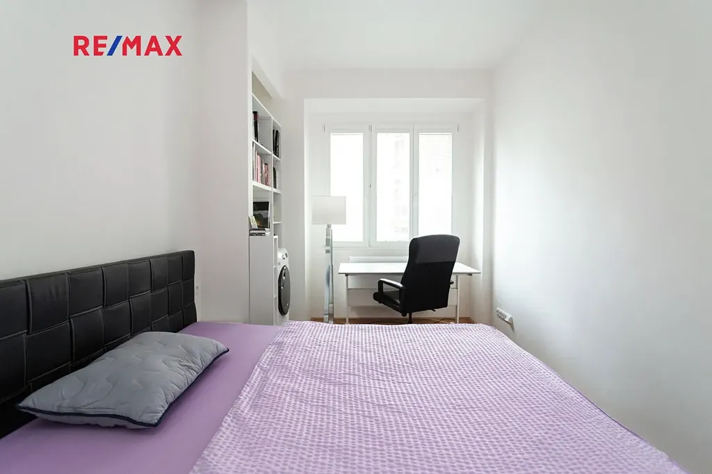 Kuchyně s moderní kuchyňskou linkou, lednicí a barovým sezením. Obývací část a ložnice s okny do klidného vnitrobloku. Koupelna se sprchovým koutem a toaletou, prostorná předsíň. Dřevěné parkety, dlažba. Sklep. Pračka, sušička.