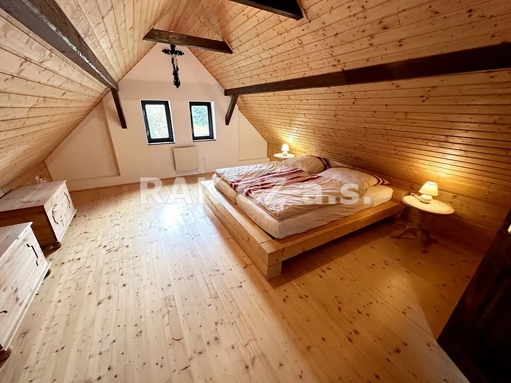 Předmětem prodeje je zděná chalupa o dispozici 3+1, o jednom nadzemním podlaží a podkroví, postavená před cca 150 lety. Situována je na vlastním, členitém, k jiho-západu svažitém pozemku, přibližně obdélníkového tvaru, v obci Nová Paka – Valdov, okres Jičín. Celková výměra pozemků činí 1.367 m2, z toho zastavěné plochy a nádvoří 198 m2, zahrada 1.169 m2. Jedná se o klasický, samostatný objekt obdélníkového půdorysu, celková užitná plocha činí cca 130 m2, který je situován v zástavbě rodinných domů a chalup, přístupný po obecní asfaltové komunikaci. V přízemí je vstupní hala ; z ní samostatně přístupná velká obytná místnost s kachlovými kamny ; a samostatně situovaná kuchyně s jídelním koutem a novou, dřevěnou, zakázkově vyrobenou, kompletně vybavenou kuchyňskou linkou ; dále poté koupelna se sprchovým koutem, umyvadlem, bidetem a toaletou a technická místnost s pračkou. Podkroví je přístupné dřevěnými schody ze vstupní haly a tvoří jej dvě velmi prostorné, zařízené ložnice s okny ve štítech domu, s krásnými výhledy na zahradu. Integrovány jsou zde velké dřevěné skříně na míru. Objekt je napojen na elektřinu (220V a 380V), voda je čerpána z vlastní studny (vrt cca 25 m), odpad je sveden do dvoukomorového septiku. Vytápění chalupy zajištěno třemi způsoby. Krbovými kamny s rozvodem teplého vzduchu po celém domě, se dvěma okruhy a elektronickou regulací intenzity, podlahovým vytápěním (elektrickým) v obytné místnosti, kuchyni a koupelně, či elektrickými přímotopy s kamennou akumulační deskou ve všech místnostech. Ohřev vody zajišťuje elektrický bojler. Dům je po kompletní rekonstrukci v perfektním stavu (nové podlahy, omítky, okna, rozvody vody, elektřiny, systémy vytápění domu atd.) Nové je i veškeré vybavení a zařízení domu, které je z větší části nepoužité. Součástí prodeje je i nově restaurovaný, dobový nábytek z Podkrkonoší. V horní části zahrady je velká kůlna na nářadí, u domu (za větrem) velká terasa s posezením a nově postavenou velkou, zděnou pizza pecí a zvenčí přístupný malý klenutý kamenný sklep. V dolní části zahrady, kde je nově zbudován přístřešek na dřevo, protéká pozemkem malý potůček, který má nově zpevněné kamenné břehy. K domu patří velká zděná garáž, na vlastním pozemku, situovaná opodál, cca 35 m od pozemku u domu. Parkování na pozemku v nově postaveném carportu, či pro několik dalších automobilů též u příjezdové cesty přímo před domem. Kompletní občanská vybavenost je k dispozici v Nové Pace (cca 3 km). Místo nabízí naprostý klid a perfektní místo pro relaxaci, či bydlení. Výborná dopravní dostupnost autem i veřejnou dopravou – autobusová zastávka cca 150 m od domu. PENB není zpracován (třída G) předpoklad D-E. Volné ihned, více informací u makléře, či dle fotodokumentace. Chalupu a její okolí vám rádi osobně...