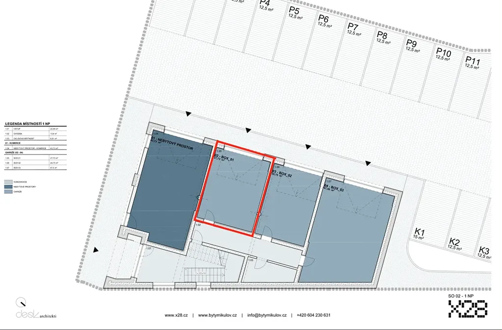 Nemovitost se nachází ve 3. patře novostavby s kolaudací v roce 2024 a splňuje požadavky na komfortní, úsporné a nadstandardní bydlení. Celková užitná plocha bytu činí 123 m², k tomu náleží prostorná terasa o velikosti 38 m² a vlastní garáž 28 m².