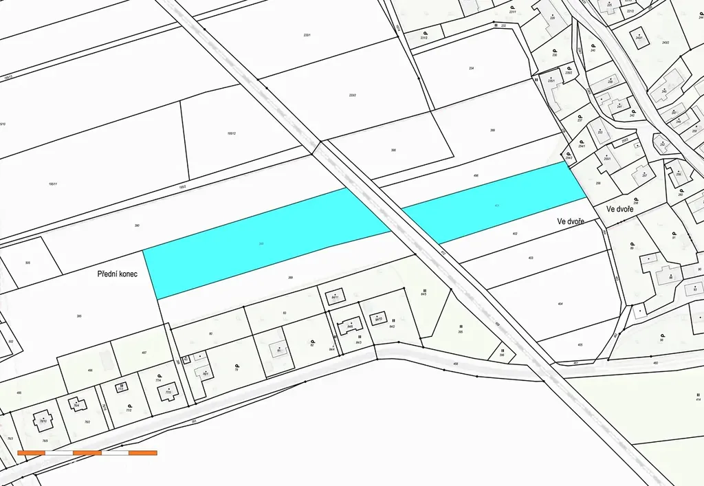 • p.č. 401 o velikosti 3570 m2 – podíl 1/6 dělá 595 m2. Parcela je přístupná po komunikaci podél kolejí ve vlastnictví státu ČR.