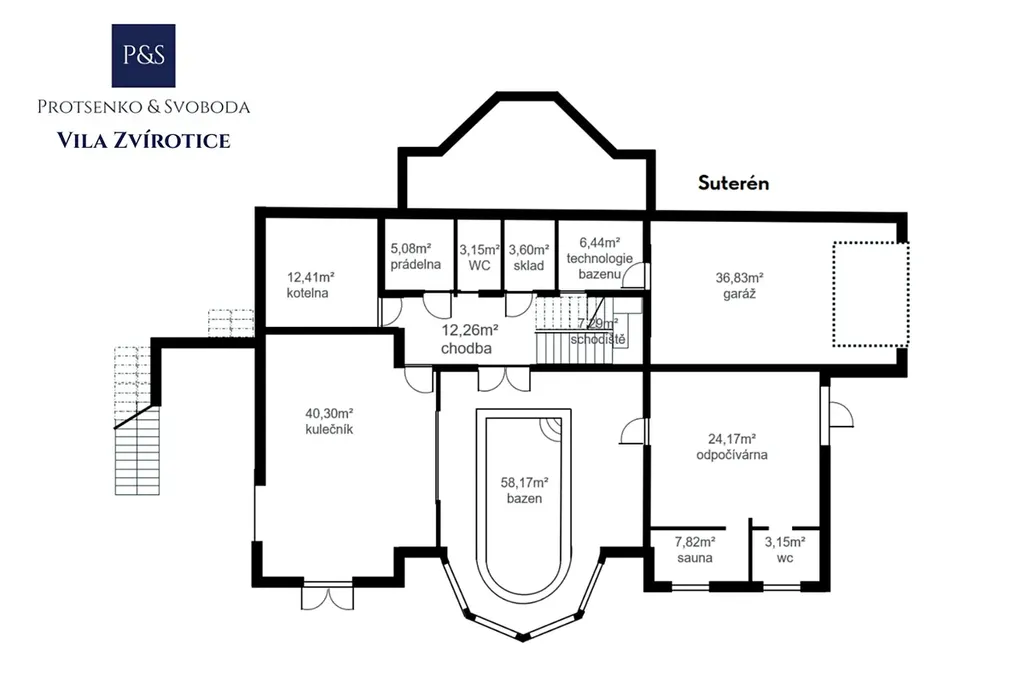 Suterén tvoří luxusní wellness zóna s vyhřívaným bazénem, saunou, odpočinkovou místností, barem a místností s kulečníkem – ideální místo pro relaxaci i společenské chvíle.