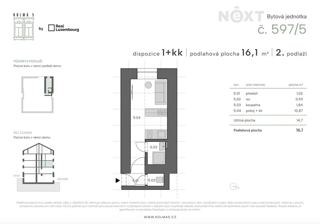 Tato konkrétní jednotka č.5 o dispozici 1kk a podlahové ploše 16,1 m2 se nachází ve 2 nadzemním podlaží s výhledem do zahrady. Je členěna na vstupní chodbu, oddělenou koupelnu, samostatnou toaletu a obývací pokoj s kuchyňským koutem. Přesné rozložení místností, či možný budoucí stav si můžete prohlédnout na přiloženém půdorysu a vizualizacích. Vytápění je řešeno elektrickými přímotopy a ohřev vody elektrickým bojlerem.