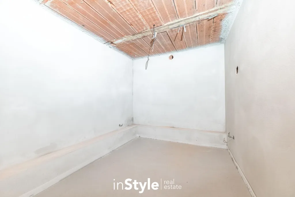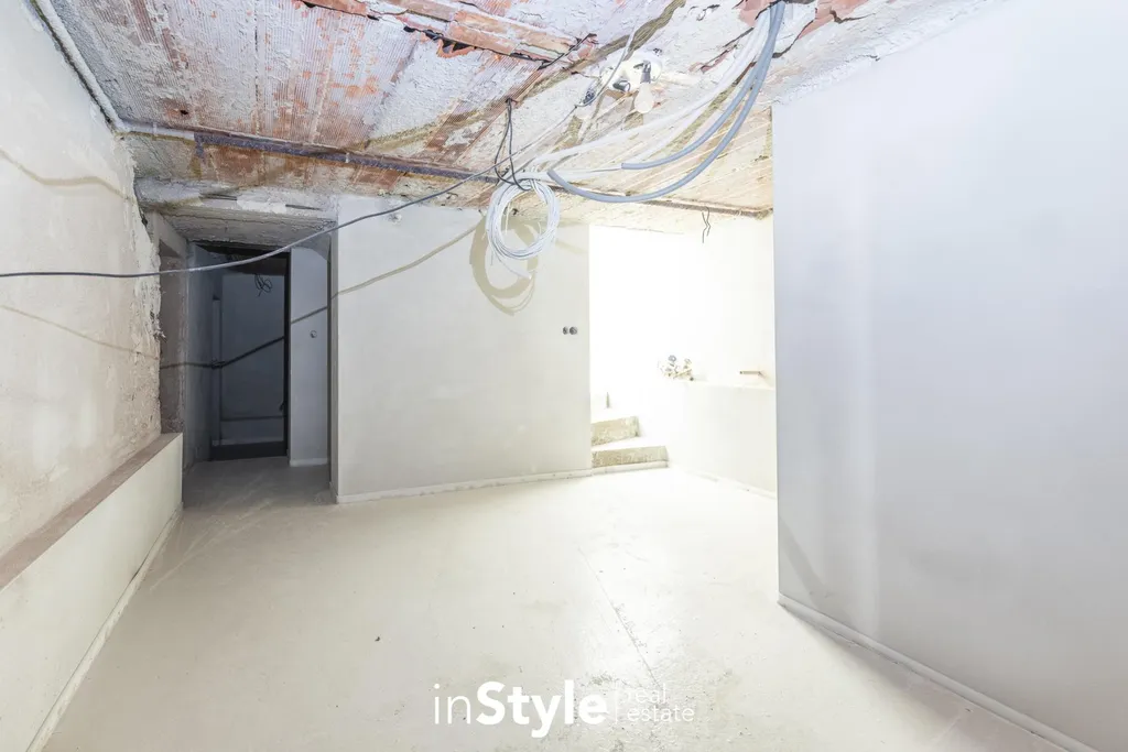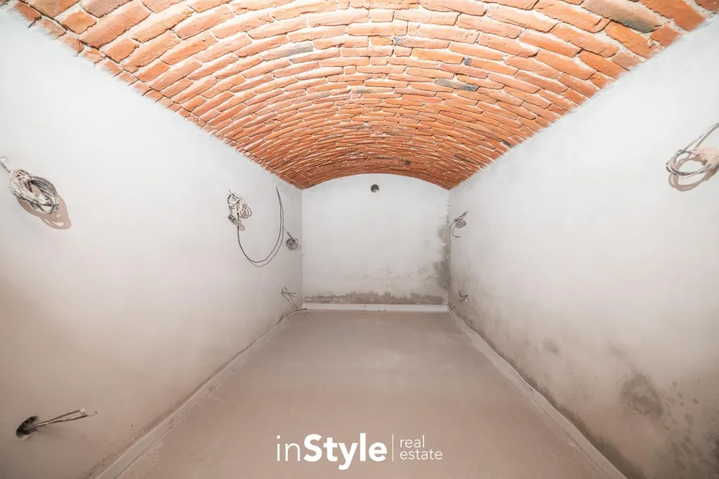 Dům je kompletně podsklepený, se zázemím pro technickou místnost, dílnu, sklad i vinný sklep s posezením. V přízemí se nachází vstupní chodba, koupelna se sprchovým koutem, samostatné WC a prostorný obývací pokoj s přípravou pro krb a vstupem na terasu. Ve druhém podlaží pak naleznete hlavní ložnici s výhledem do parku, dva dětské pokoje orientované do vnitrobloku, další koupelnu s vanou a samostatné WC.