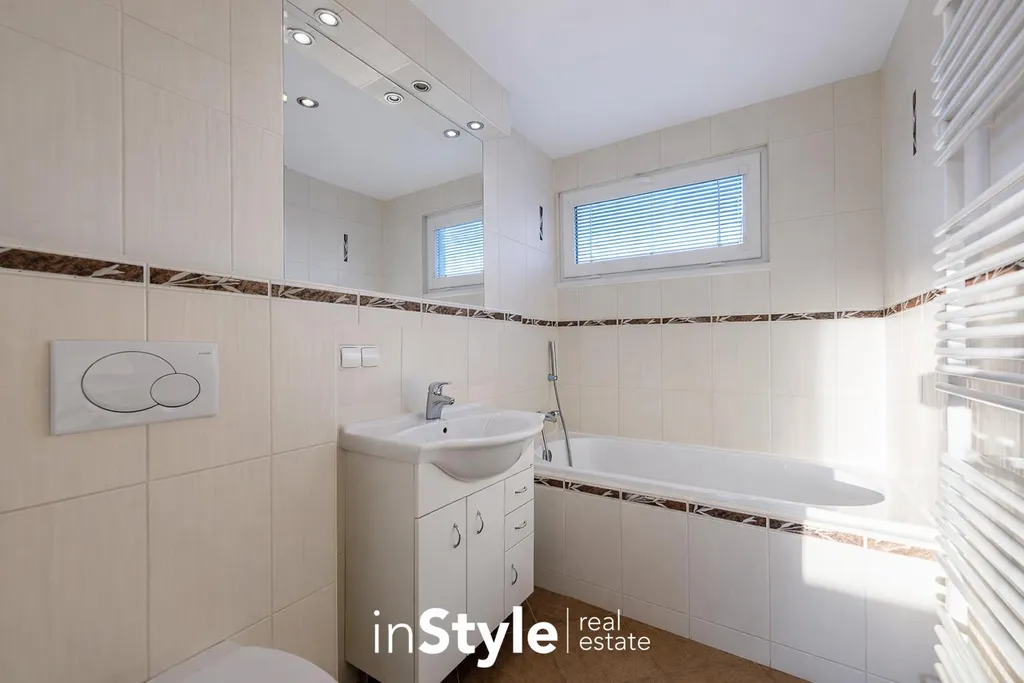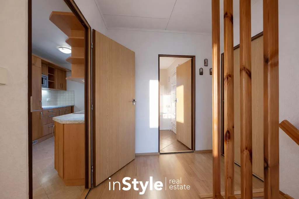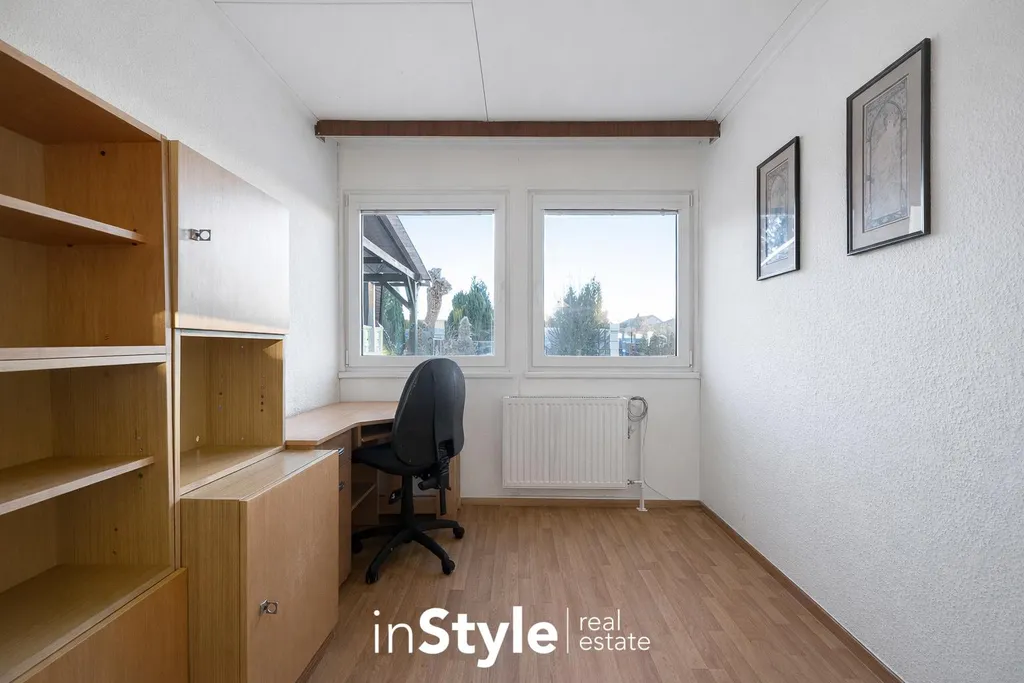 Dům stojí na pozemku o celkové výměře 381 m2 a celkem nabízí 195 m2 užitné plochy. V přízemí domu máte k dispozici vstupní chodbu s halou, zmíněnou garáž, první koupelnu se sprchovým koutem, dva samostatné pokoje a knihovnu s pracovnou. Ve druhém podlaží je centrální chodba, kuchyně s jídelnou, obývací pokoj, hlavní ložnice, dětský pokoj a druhá koupelna s vanou. Co se týče parkování, jedno auto můžete zaparkovat v manuálně otevíratelné garáži a druhé klidně v nájezdu přímo před domem. A pokud byste potřebovali aut zaparkovat víc, přímo před domem se nachází veřejné parkoviště.