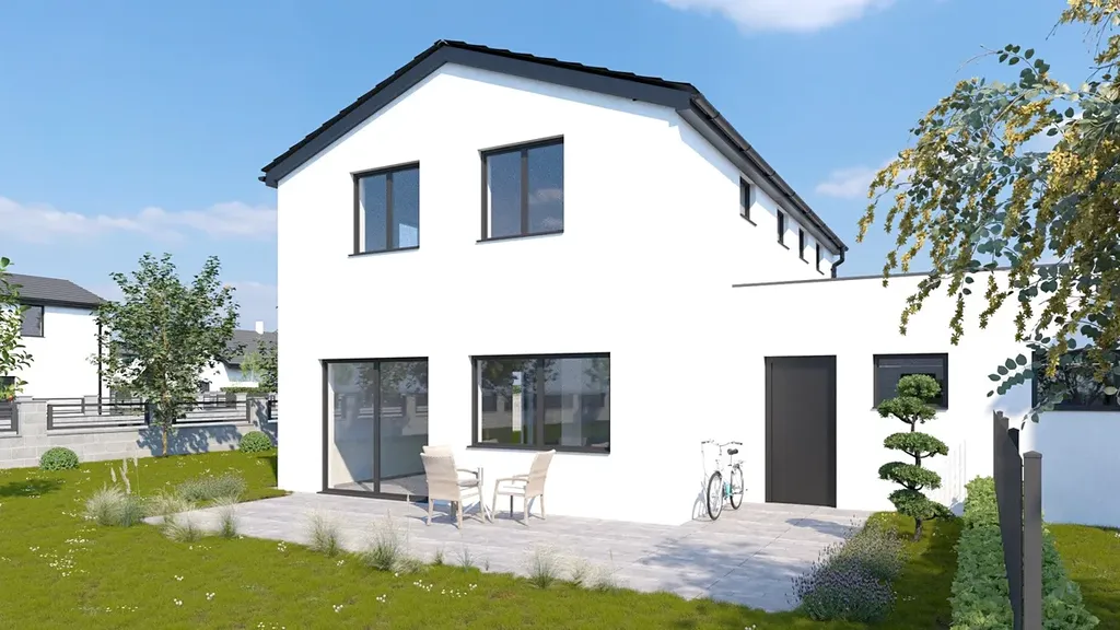 Rodinný dům "TYRKYS" se dvěma podlažími a garáží nabízí komfortní a promyšlené bydlení. V prvním patře naleznete prostorný obývací pokoj s jídelním koutem, ideální pro rodinná setkání a společné chvíle. Součástí tohoto patra je také koupelna s WC a praktická technická místnost. Druhé patro je navrženo pro maximální pohodlí a funkčnost. Obsahuje samostatnou šatnu, oddělené WC a velkou koupelnu, která je připravena na instalaci vany i sprchového koutu. Hlavní ložnice poskytuje klidné místo pro odpočinek a dva stejně velké pokoje nabízejí flexibilní využití jako dětské pokoje, pracovny nebo pokoje pro hosty.