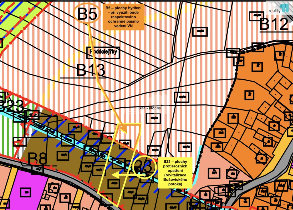 Část pozemku o rozloze 815 m² je v územním plánu vedena jako plocha k bydlení, maximální zastavitelnost 40 %, a je zde povolená stavba s přízemím a s využitelným podkrovím. Označena v přiložené fotografii jako B5.