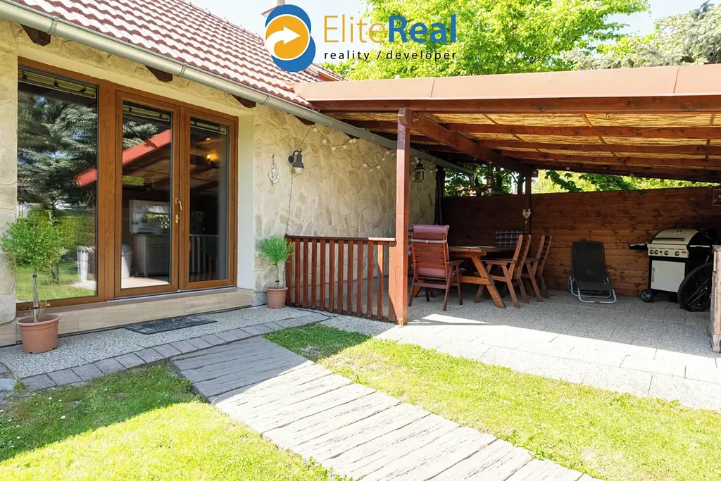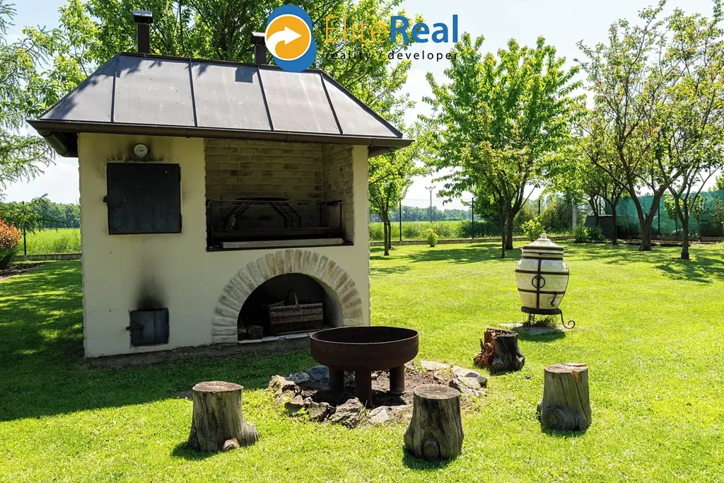 Za domem je vybudovaná okrasná zahrada, včetně zděného grilu s udírnou, zahradního jezírka a kopané studny. V levé části zahrady je příprava na závlahu (nutno zkompletovat). Wellness i závlaha jsou napojeny na studnu.