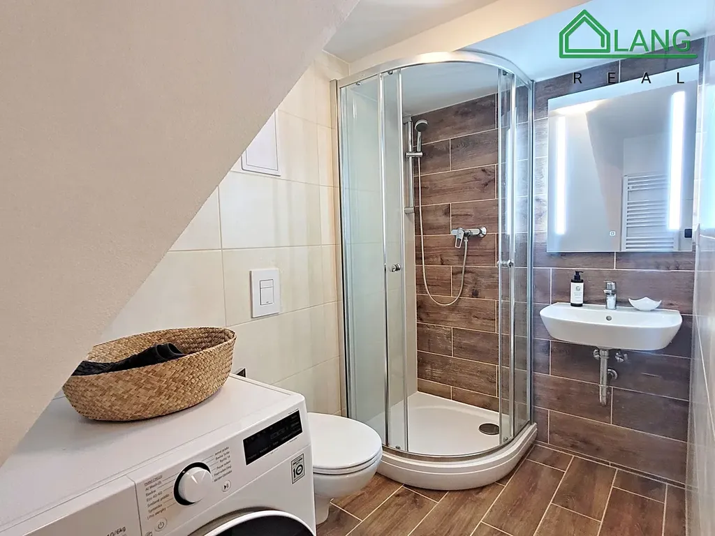 V koupelně se sprchovým koutem a toaletou se nachází pračka se sušičkou a nad umyvadlem designové podsvícené zrcadlo. Díky topnému žebříku je zajištěna v koupelně komfortní teplota v i v zimních měsících.