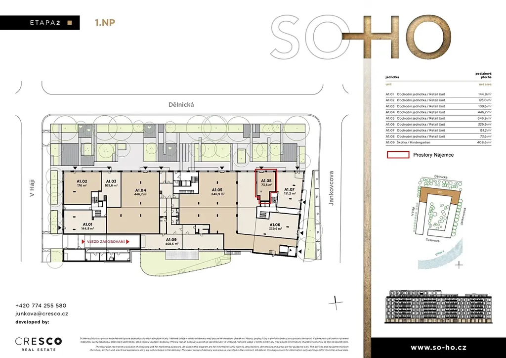 Nabízíme k pronájmu atraktivní komerční prostor o velikosti 73,6 m² v parteru druhé etapy SO-HO Rezidence. Prostor je ideální pro obchod se specialitami či bio produkty, kadeřnictví, kosmetický salon nebo jiné služby. Není vhodný pro kavárnu nebo pekárnu. Jednotka bude předána ve stavu shell & core, připravená k individuálním úpravám a dokončení dle potřeb nájemce.
