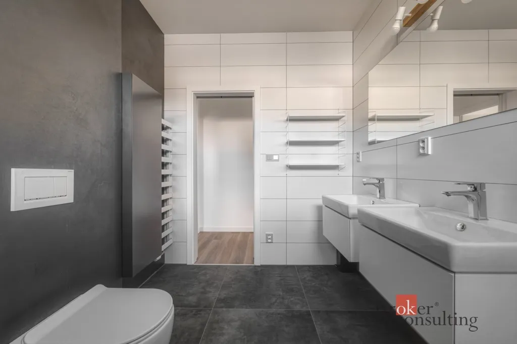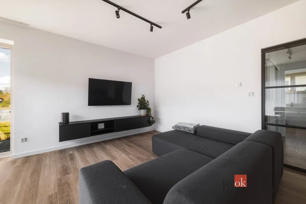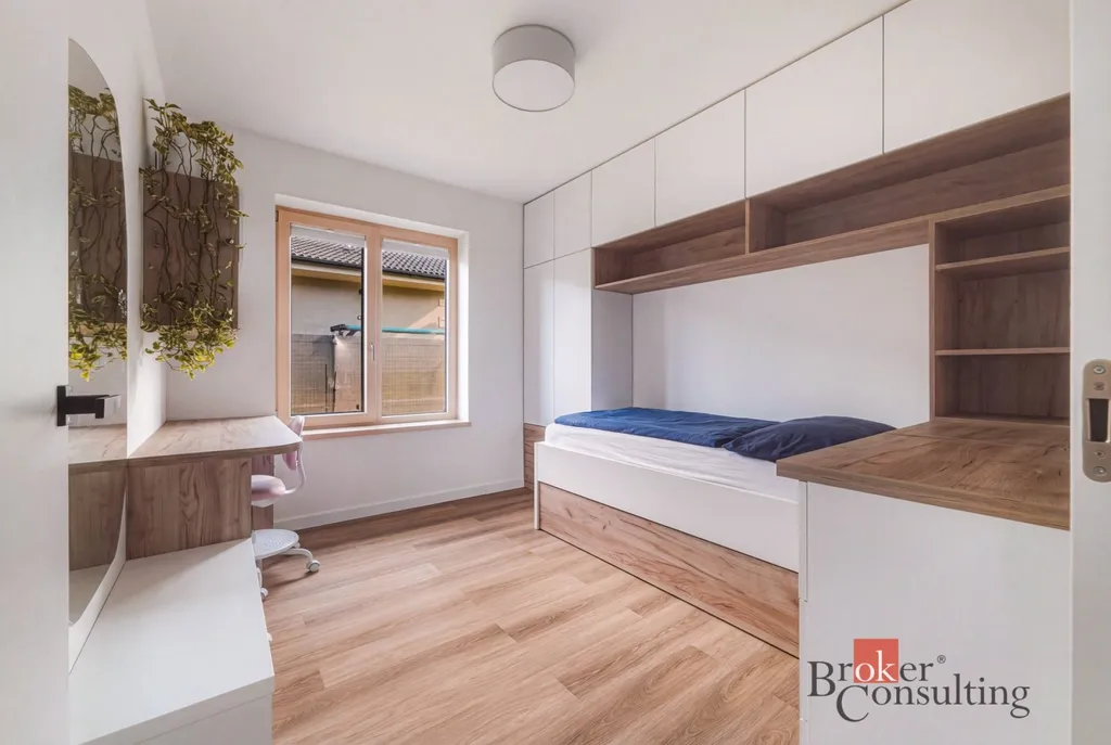 Interiér domu je navržen s důrazem na prostor a dostatek soukromí pro všechny členy domácnosti díky rozloze 135 m². Srdcem celého domova je velkorysý obývací pokoj s jídelnou a moderní kuchyní vybavenou kvalitními spotřebiči, mezi které patří například americká lednice, myčka nádobí a vestavná trouba. Vysoký standard bydlení doplňují vestavěné skříně a další doplňky na míru, které zajišťují dostatek úložných prostor pro zachování čistého designu. Z hlavního obytného prostoru lze vstoupit přímo na venkovní terasu. Dispozice dále zahrnuje ložnici, dva dětské pokoje a samostatnou pracovnu. Praktickou stránku bydlení zajišťují dvě koupelny, prostorná předsíň a technická místnost. O tepelný komfort v celém domě se stará podlahové vytápění a pro budoucí majitele je zde již připraven kompletní systém pro instalaci kamerového zabezpečení.