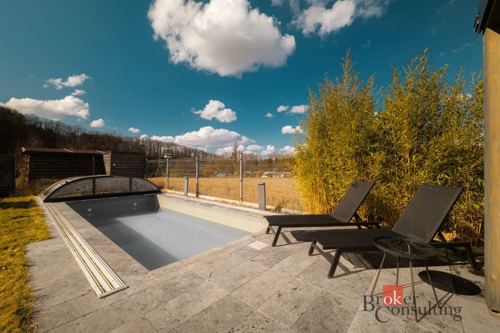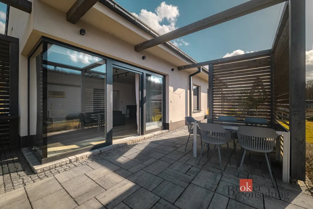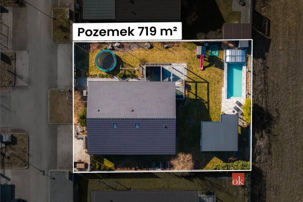 Zahrada, která je součástí pozemku o celkové výměře 719 m², je situována v nové, moderní zástavbě obce. Dominantou exteriéru je bazén s posuvným zastřešením, který výrazně prodlužuje sezónu koupání. Součástí pozemku je také zateplený zahradní domek o ploše 10 m² s vlastní stavební dokumentací a přivedenou elektřinou, který nabízí všestranné využití jako dílna nebo sklad. Před domem je k dispozici plocha ze zámkové dlažby s kapacitou až pro tři vozidla, přičemž pozemek nabízí dostatek prostoru pro případnou realizaci garáže. K domu se momentálně pracuje na štítku PENB.