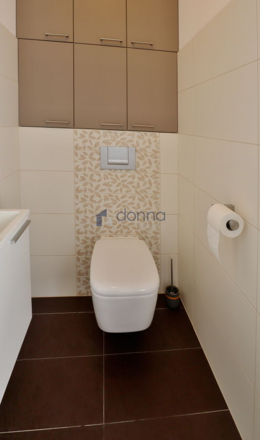 V koupelně je vana a sprchový kout, je zde umístěná i pračka a sušička. Samostatná toaleta.