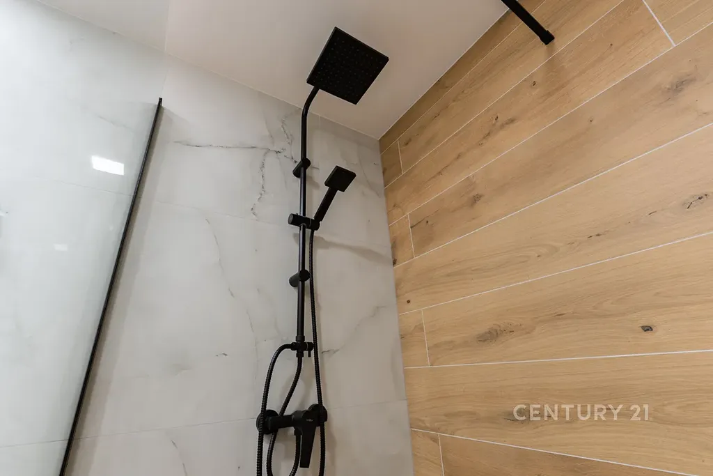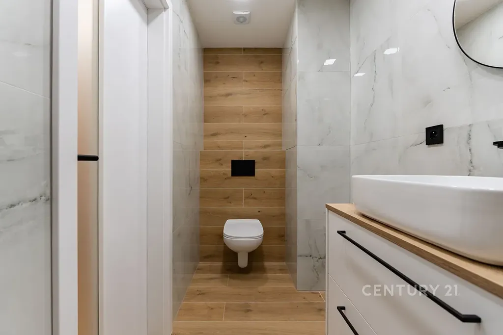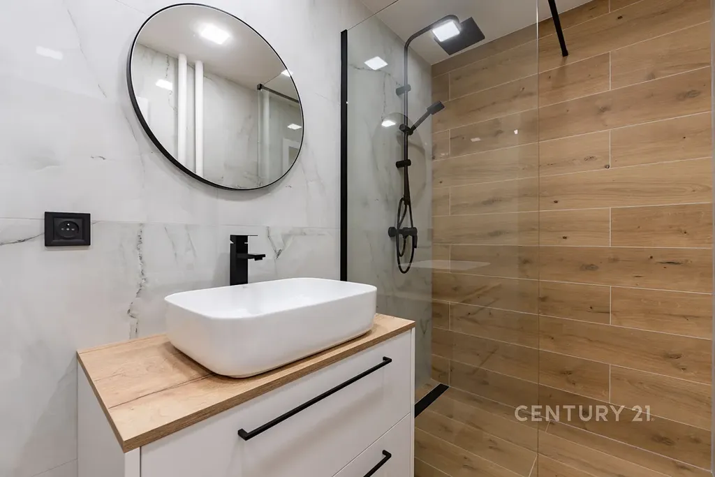 • Stylová koupelna se sprchovým koutem, velkoformátovými obklady, novým sanitárním vybavením, skříňkou pod umyvadlo a WC