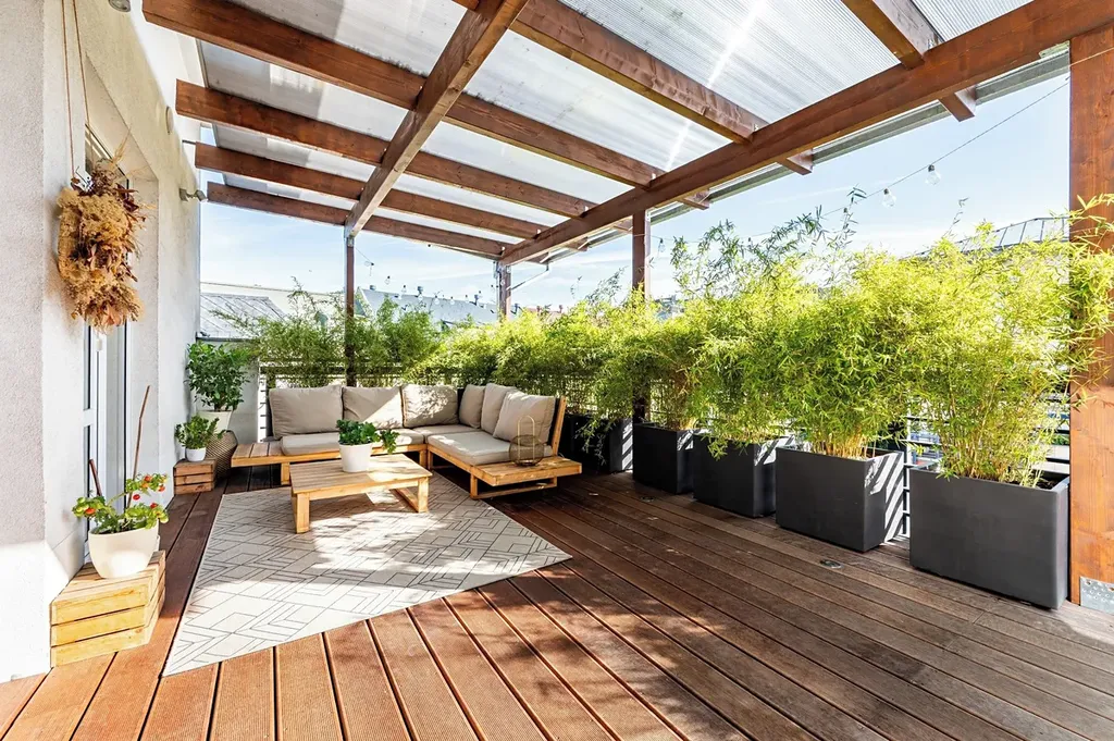 velká terasa po kompletní rekonstrukci (tropické dřevo, osvětlení)