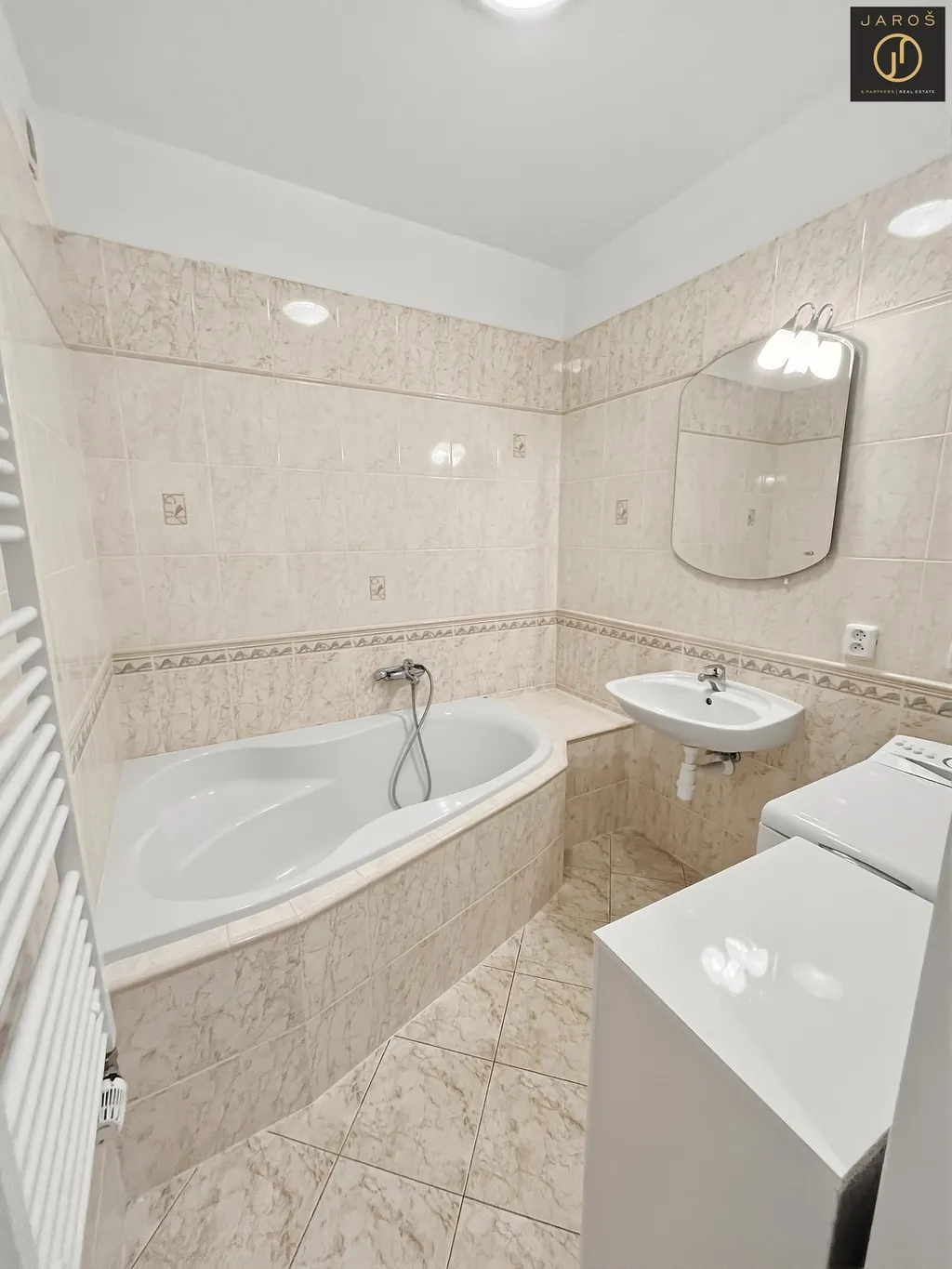 Velká koupelna s rohovou vanou, umyvadlem, skříňkou a pračkou. WC je samostatné.