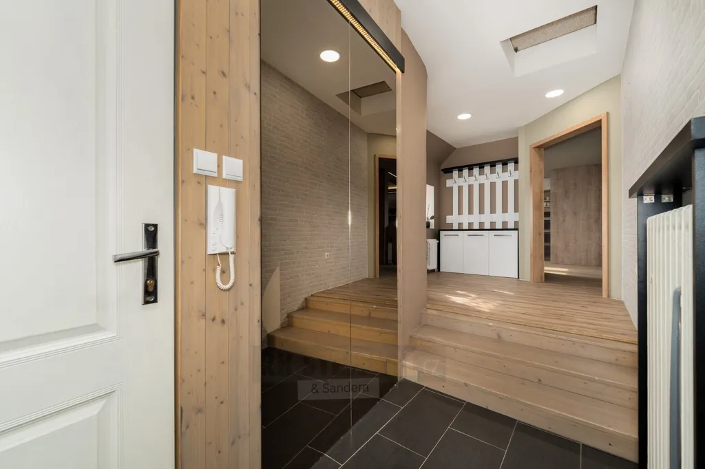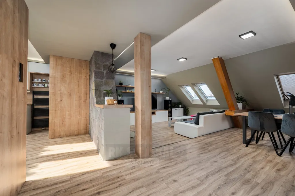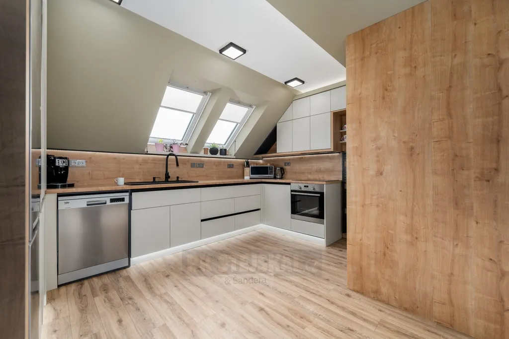 Interiér bytu vás okouzlí svou atmosférou – přiznané půdní trámy, krb a střešní okna vytvářejí útulný a zároveň vzdušný prostor. Byt prošel velmi zdařilou rekonstrukcí a modernizací, disponuje odhlučněnými podlahami a praktickým dispozičním řešením, které zajistí komfort i větší rodině.