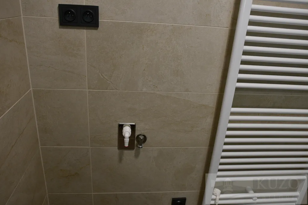 Koupelna je prostorná a vybavená sprchovým koutem, moderním prosvětleným, kruhovým zrcadlem. Příprava na pračku je samozřejmostí.