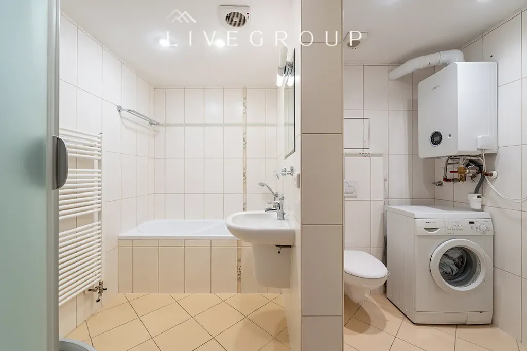 Byt zaujme promyšlenou dispozicí, která nabízí vstupní předsíň 6,7 m2, prostorný obývací pokoj s kuchyňským koutem 33 m2, samostatnou ložnici 17,3 m2 a velmi prostornou koupelnu 7,5 m2 (s umyvadlem, vanou i sprchovým koutem) zdí oddělenou od toalety, kde je dost prostoru na pračku.