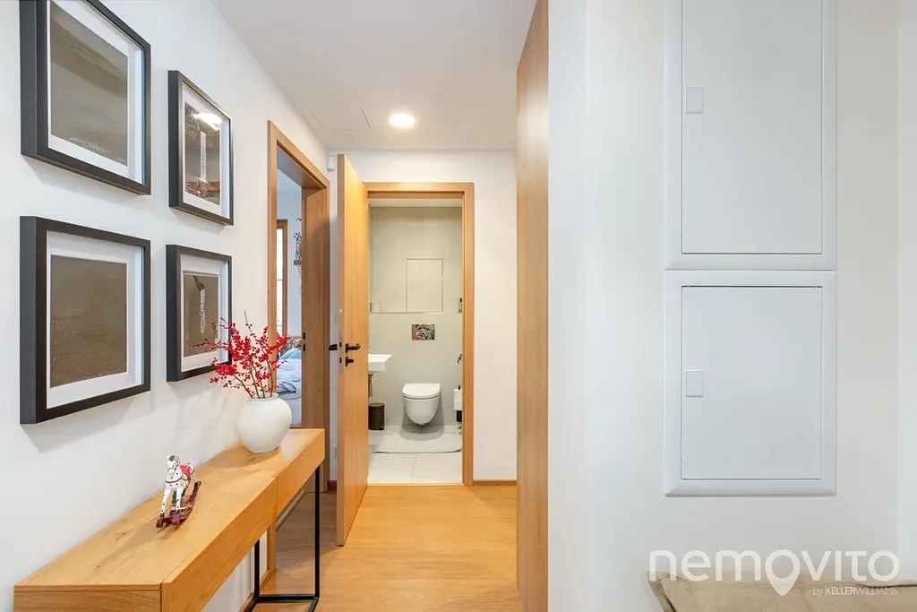 Plocha bytu je 72 m2, zahrada má velikost 116 m2 a sklep 2 m2. Maximální komfort zajišťuje podlahové topení s příjemnou dřevěnou podlahou, klimatizace a venkovní žaluzie. Ačkoliv je byt pronajímán bez volně stojícího nábytku, v obývacím pokoji se zařizováním moc práce nebude, neboť většina nábytku je vestavěná. Kuchyně je plně vybavená všemi nutnými spotřebiči a je po vzoru celého bytu ve vysokém standardu provedení.