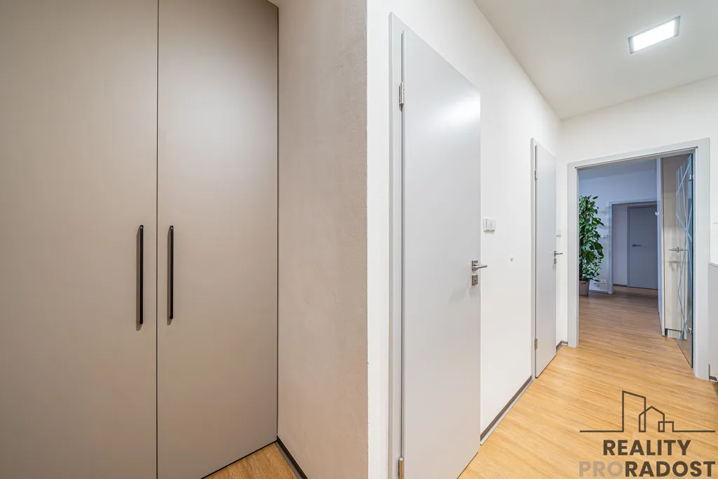 Byt je velmi hezky řešený, obývací pokoj tvoří středovou část bytu se vstupem do kuchyně, na balkon a do dalších dvou pokojů. Byt je moderně zrekonstruovaný se spoustou úložného prostoru ve vestavných skříních, šatně, komoře a spíži. Další úložný prostor nabízí sklep v suterénu. K bytu je možné pronajmout 1- 2 garážové stání.