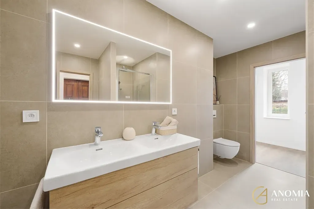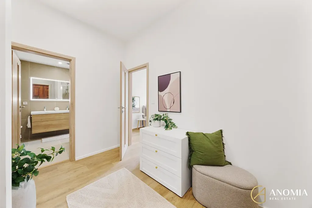 Celkový charakter bytu podtrhují vysoké stropy a renovované jasanové parkety, které dodávají interiéru eleganci a osobitost. V dalších částech bytu je položena kvalitní zátěžová vinylová podlaha, jejiž dekor je sladěný se zbytkem interiéru. Byt dále nabízí dva samostatné neprůchozí pokoje, které lze využít jako ložnici, dětský pokoj nebo pracovnu. Koupelna s walk-in sprchovým koutem, dvoj umyvadlem a led zrcadlem je provedena v nadčasovém stylu s důrazem na praktičnost. Komfort v koupelně zajišťuje elektrické podlahové vytápění a otopný žebřík. Na koupelnu navazuje technická místnost.