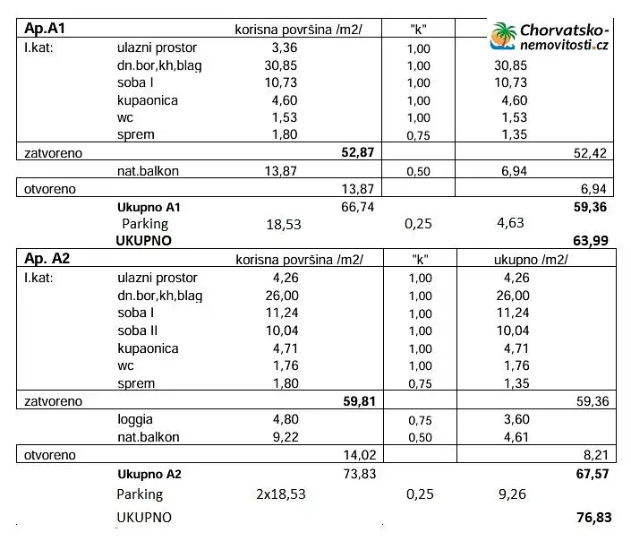 Na prodej byt 2+1 (A1) o celkové ploše 63.599 m2 v prvním patře novostavby v Novalji