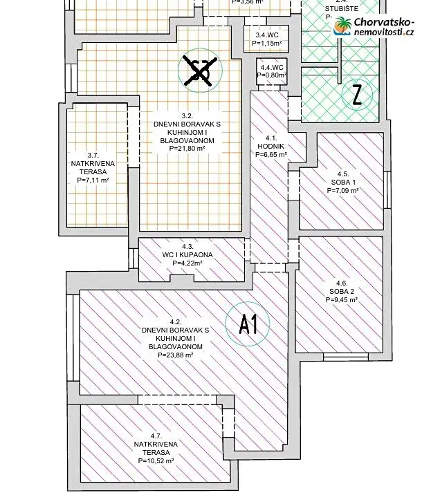 Apartmán A1 se nachází v prvním patře budovy a skládá se z: Vstupní haly, obývacího pokoje s kuchyní a jídelnou, ložnice I, ložnice II, koupelny, WC a krytého balkonu.