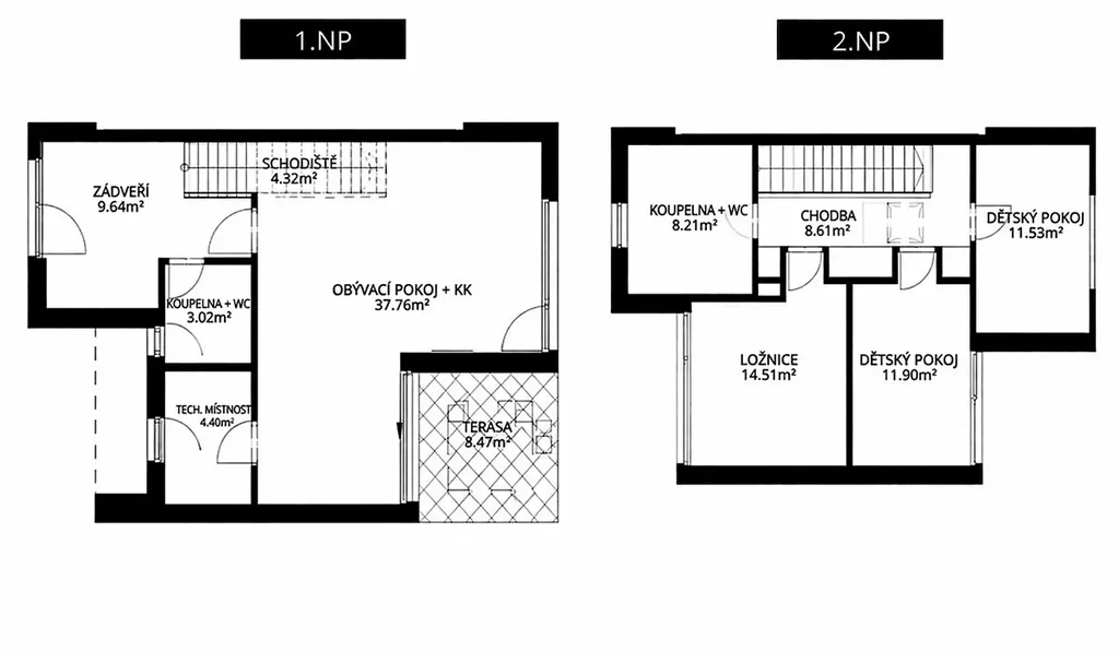 V horním podlaží se nachází soukromá klidová zóna domu, tvořená třemi ložnicemi (14 m2, 12 m2 a 12 m2) a galerií, která nabízí další úložné možnosti. Každá místnost je navržena s důrazem na čistotu linií, funkčnost a dostatek světla. Druhá koupelna s vanou i sprchovým koutem poskytuje komfort odpovídající moderním nárokům na rodinné bydlení.