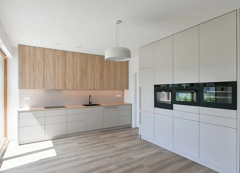 Dominantou přízemí je vzdušný obývací prostor s plně vybavenou designovou kuchyní (38 m2), který plynule navazuje na terasu a upravenou zahradu, čímž přirozeně propojuje interiér s exteriérem. Tento prostor je ideálním místem pro každodenní život i společenská setkání. Kuchyň je vybavena prémiovými spotřebiči značky AEG, včetně indukční varné desky, kombinované trouby, horkovzdušné trouby s pyrolýzou, myčky Bosch a vinotéky, což ocení i náročnější klientela.
