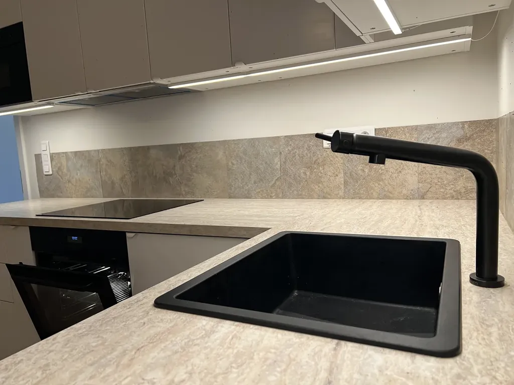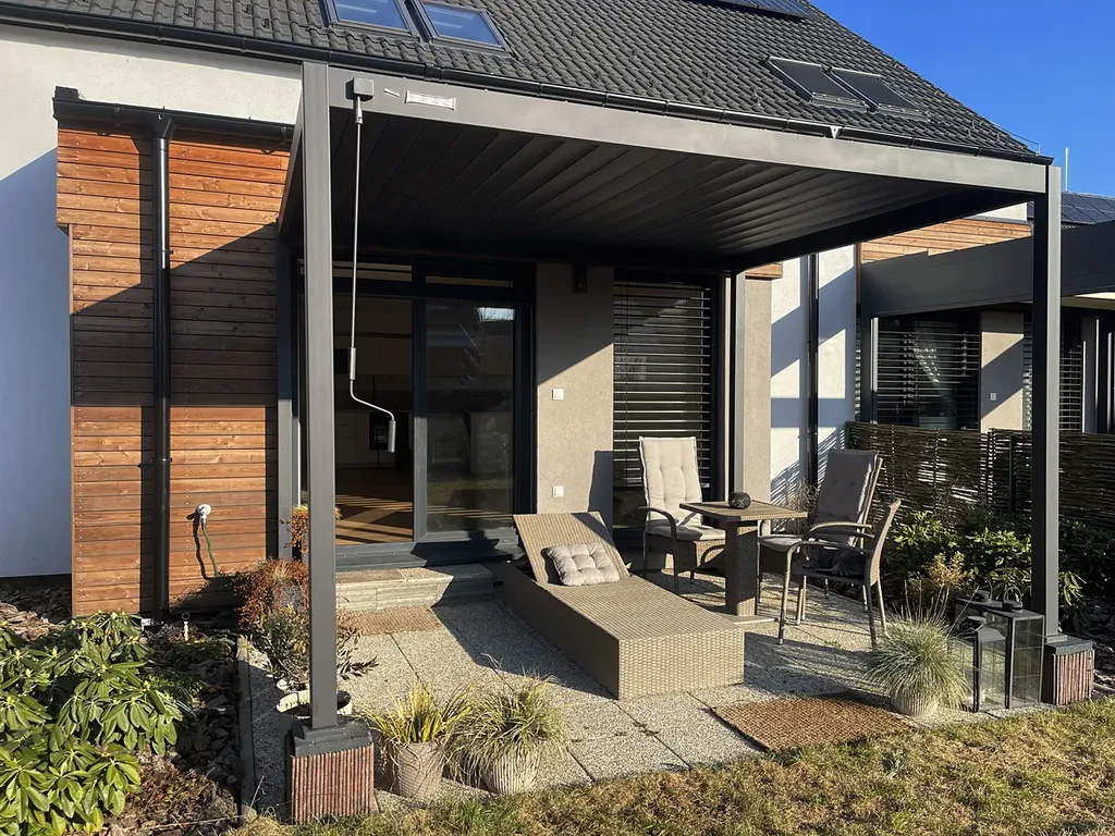 V přízemí domu vás přivítá vstupní zádveří, na které navazuje koupelna se sprchovým koutem a toaletou. Dominantou přízemí je prostorný obývací pokoj s plně vybaveným kuchyňským koutem, který tvoří přirozené centrum domu – místo pro rodinná setkání, vaření i odpočinek. Díky velkému francouzskému oknu s automatickými žaluziemi je prostor krásně prosvětlený a zároveň umožňuje přímý vstup na zastínitelnou pergolu o velikosti 10 m². Ta navazuje na útulnou relaxační zahradu, která poskytuje dostatek soukromí pro letní posezení, grilování nebo odpočinek po práci. Praktickým doplňkem přízemí je také komora, umístěná pod schody, ideální pro uskladnění sezónních věcí nebo domácích potřeb.