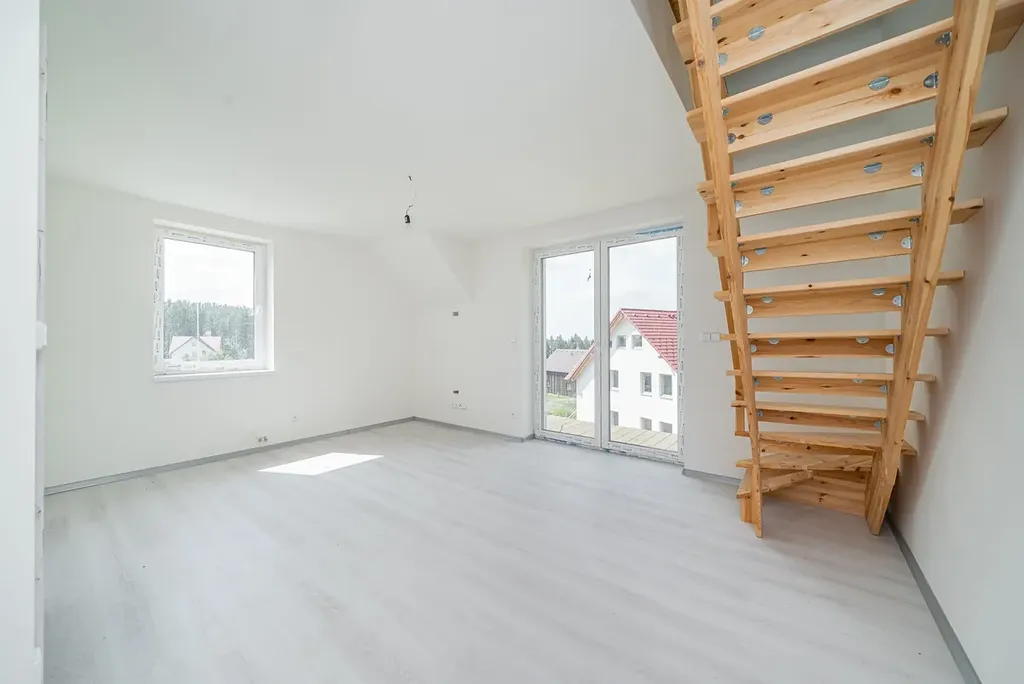 Skládá se ze zádveří, ložnice, koupelny s WC, obývacího pokoje s kychyňským koutem s přístupem na terasu a velkého podkrovního pokoje.