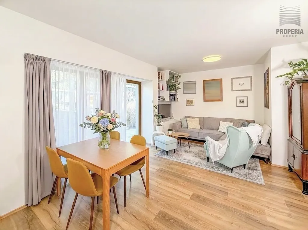 Dominantou bytu je prostorný obývací pokoj s kuchyňským koutem včetně vinotéky, který je přímým vstupem propojen se zahradou a vytváří tak jedinečný obytný prostor s atmosférou rodinného domu.