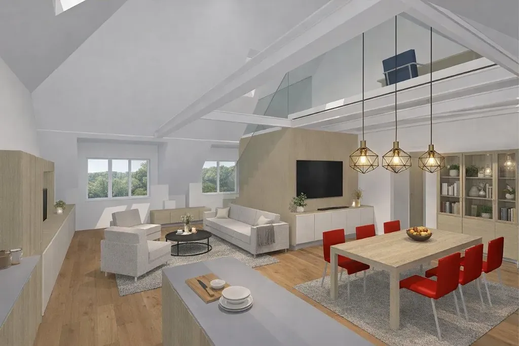 Dominantou bytu je velkorysý obytný prostor s architektonickou galerií, jejíž konstrukce z ocelového rámu vytváří otevřený a světlem zaplněný interiér bez rušivých podpěr. Konzolové schodiště a industriální prvky v kombinaci s přírodními materiály dodávají prostoru moderní a zároveň nadčasový charakter. Galerie může sloužit například jako pracovna, knihovna nebo další pokoj.