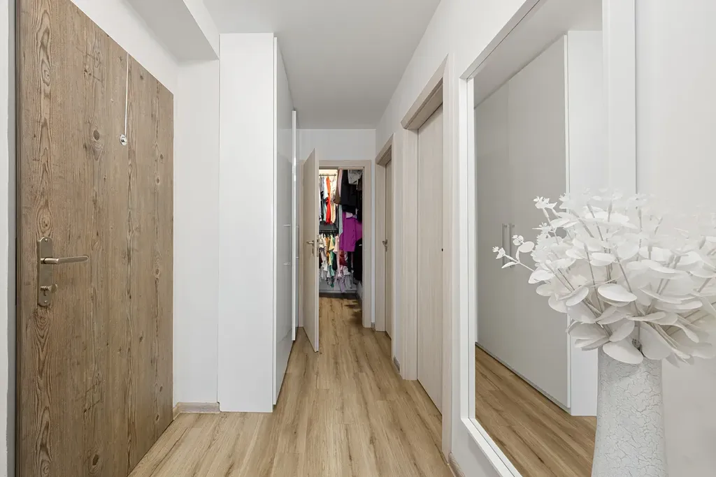 Dispoziční řešení bytu je 3+kk s částečně zapuštěnou kuchyní, dvěma samostanými ložnicemi, koupelnou se sprchovým koutem s toaletou a prostornou šatnou. K bytu patří prosluněná lodžie o velikosti 4 m2. Byt je plně vybaven, takže se můžete ihned nastěhovat a začít užívat nového domova bez nutnosti dalších úprav. Majitelé jsou ochotni ponechat většinu zařízení.