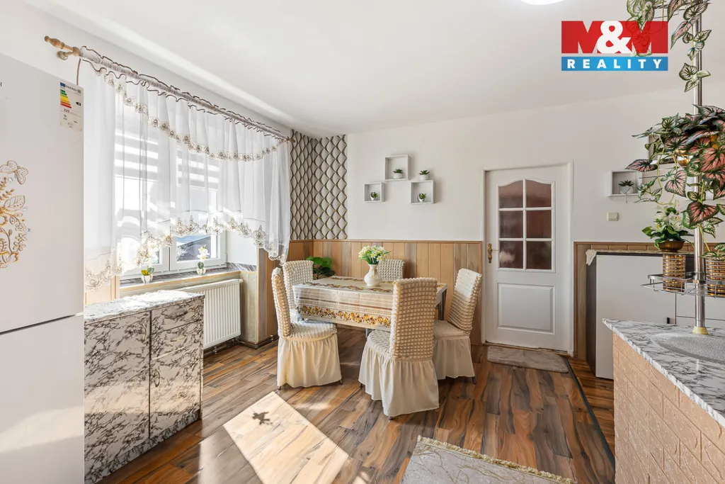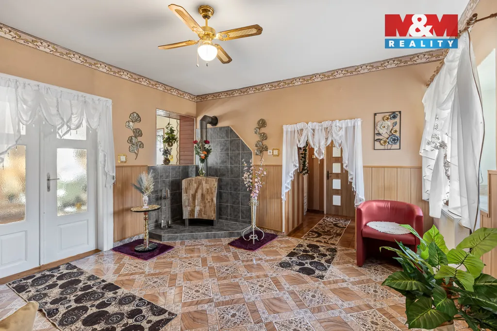 Dům má dispozici 5 + 1 a obytná plocha je v patře. Vnitřním schodištěm se tak dostaneme do vstupní haly, kde jsou krbová kamna. Z ní pak do ložnice nebo koupelny a WC. Rovně vejdeme do jídelny, ze které vlevo je obývací pokoj a vpravo kuchyně. Z kuchyně se pak dostaneme do dvou dalších ložnic.