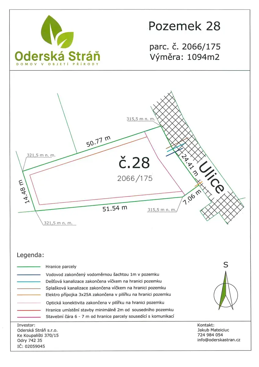 - Ing. sítě na hranici pozemku (vodovod, dešťová a splašková kanalizace, elektro pilířek, optica), příjezd asfaltová komunikace