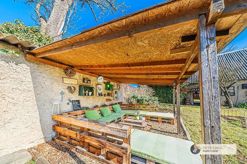 Dvůr doplňují dřevník, terasa s posezením, vlastní studna a jímka na dešťovou vodu.