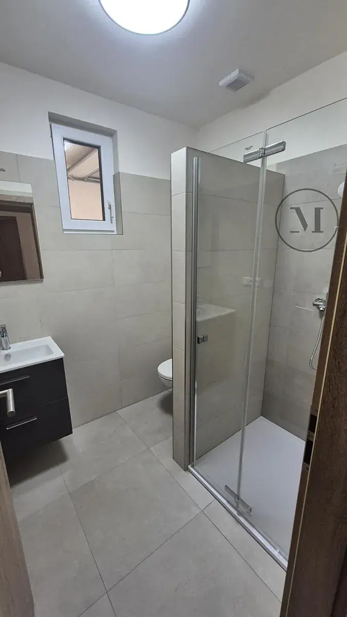 Moderní koupelna se sprchovým koutem a okénkem pro přirozené větrání