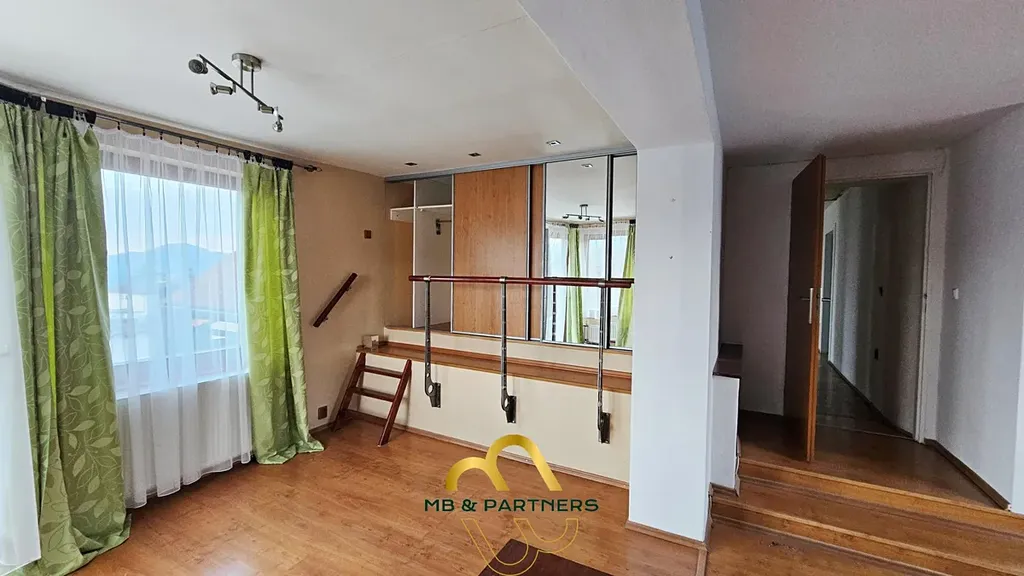 Tato horní část domu nabízí prostorný obývací pokoj, úložné prostory, koupelnu se sprchovým koutem, 3 samostatné ložnice, terasu s orientací na S-V a nádherným výhledem na okolní kopce.